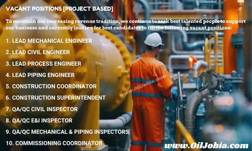 – At least 10 (ten) years’ experience in similar position with min. 2 (two) years’ project experience in process and construction of onshore oil and gas production facility (same size)